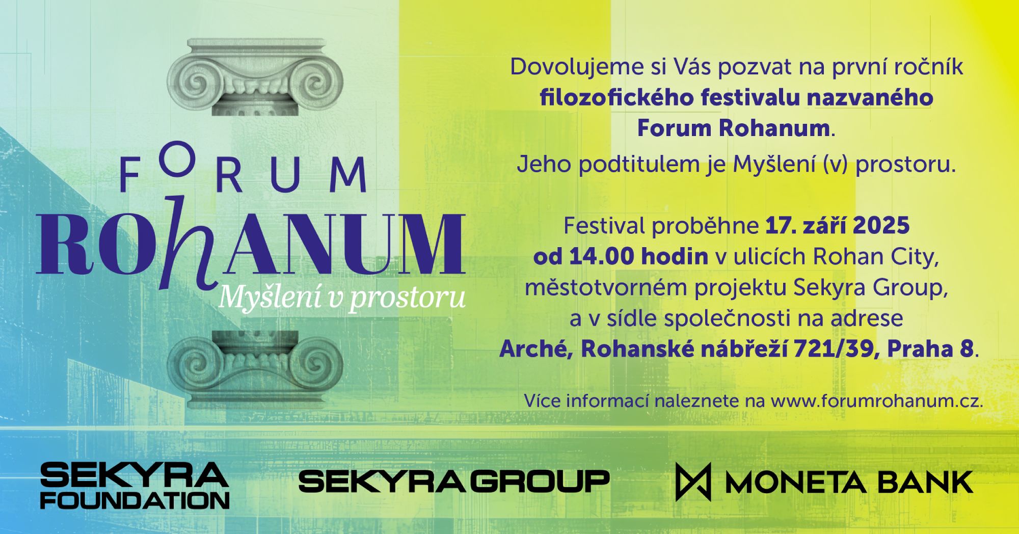 Nadace Sekyra Foundation pořádá ve středu 17. září první ročník filozofického festivalu nazvaného Forum Rohanum. Jeho podtitulem je Myšlení (v) prostoru. Festival bude probíhat každoročně v ulicích Rohan City, městotvorném projektu Sekyra Group, a v sídle společnosti, které nese symbolický název Arché, tedy filozoficky první princip a počátek.